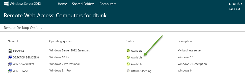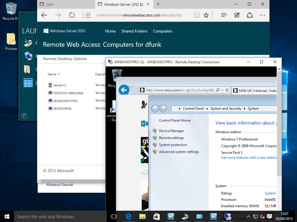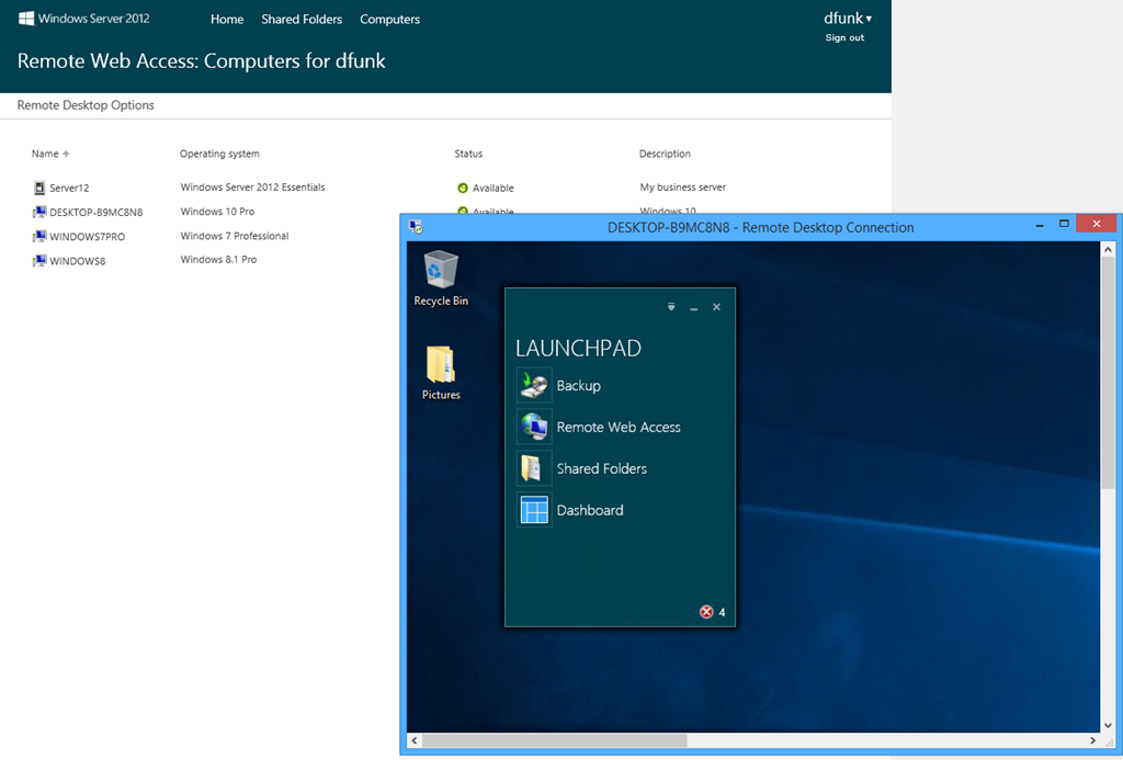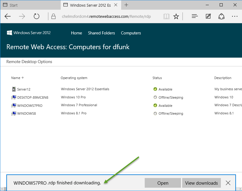So moving on to the Remote Desktop test, as with SBS 2011 Essentials, clicking on a PC in the RWA screen will generate an RDP File.