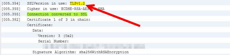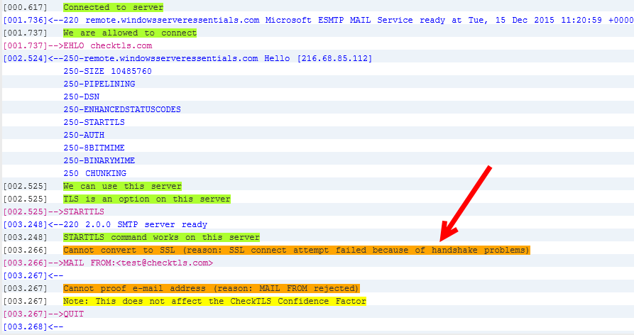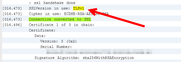 Next I turned my attention to SMTP TLS. Using a reputable search engine, I found a website that would test a TLS connection for me. On a system where TLS 1.0 is enabled and functioning correctly, you will see that TLS 1.0 is negotiated.