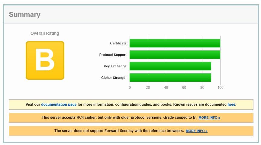 Looking at the results here, I decided to look at disabling RC4 as this was holding me back to a ‘B’.
