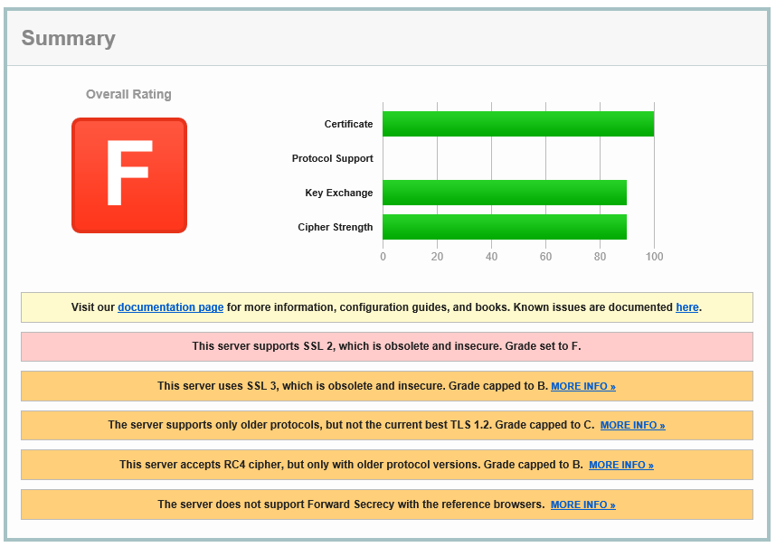 Disabling SSL 2.0 seemed like a reasonable next step and is easy enough following the procedure above, after another reboot, I reran the scan expecting a result of at least C.