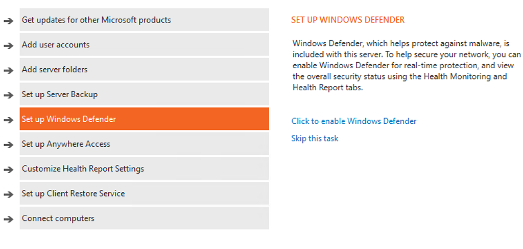 On opening the Dashboard, the first change we notice is a new menu item to ‘Setup Windows Defender’.