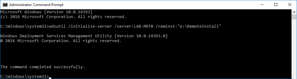 WDSUTIL /Initialize-Server /Server:LAB-MDT0 /RemInst:"e\RemoteInstall"