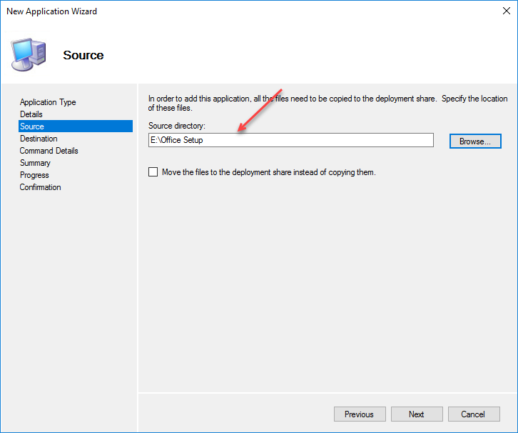 In the source directory, enter the location you extracted and downloaded Office to. MDT will copy the files to the right location on the Deployment Share.