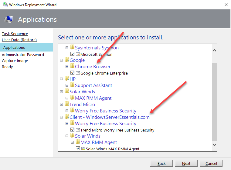 On the Applications page i can choose from any of the Applications imported into MDT to install on my client. Here i have selected Google Chrome and under my Client folder, two applications Solar Winds MAX RMM and Trend Micro.