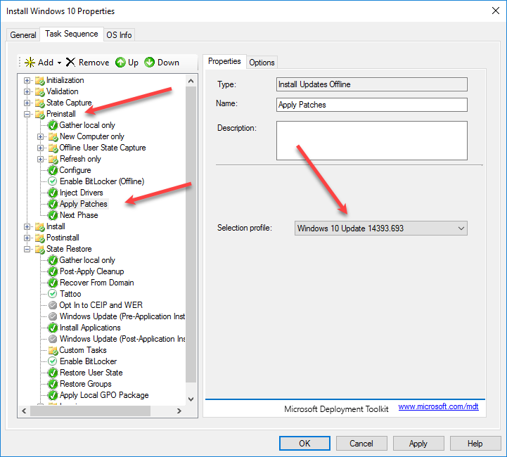 If we go back to our Task Sequence, under PreInstall and the Apply Patches section, we can change the selection profile to use the Windows 10 14393.693 update.