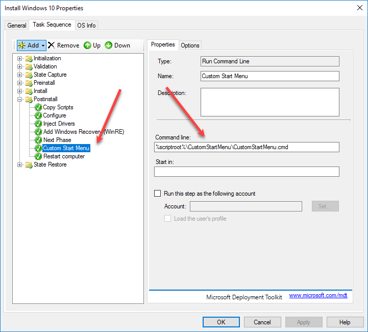 This tells MDT to run our CustomStartMenu.cmd file during the post install phase, which is still during the WinPE phase of installation, which is why we copy the XML to D: and not C:.