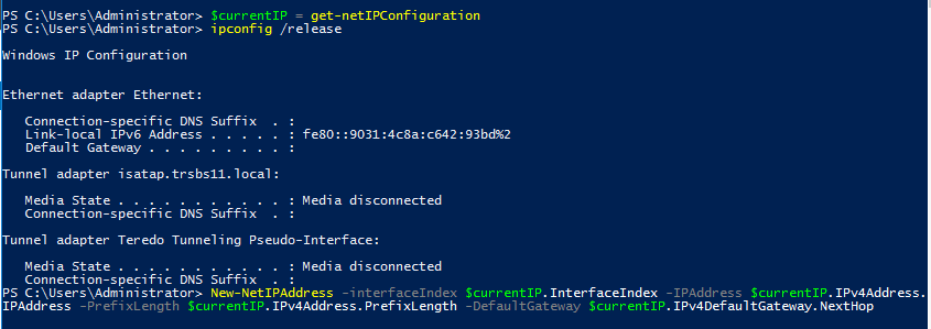 $currentIP = get-netIPConfiguration ipconfig /release New-NetIPAddress -interfaceIndex $currentIP.InterfaceIndex -IPAddress $currentIP.IPv4Address.IPAddress -PrefixLength $currentIP.IPAddress.PrefixLength -DefaultGateway $currentIP.IPv4DefaultGateway.NextHop Set-DNSClientServerAddress -interfaceIndex $currentIP.InterfaceIndex -ServerAddresses $currentIP.DNSServer.serverAddresses # end