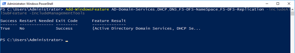 Add-WindowsFeature AD-Domain-Services,DHCP,DNS,FS-DFS-NameSpace,FS-DFS-Replication -includeAllSubFeature -IncludeManagementTools