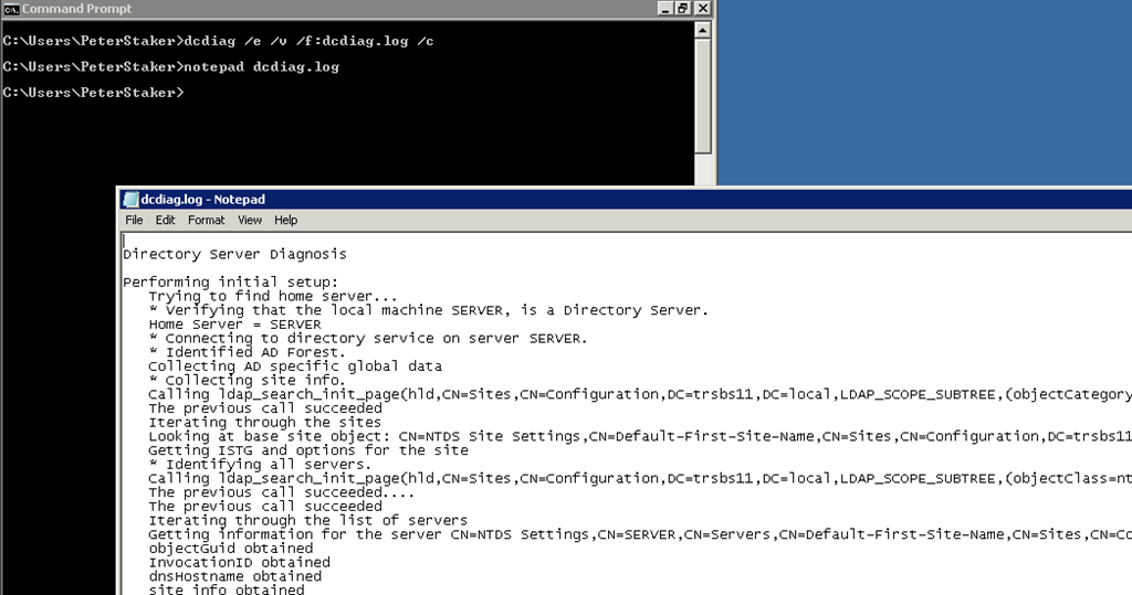 Next we can run everyone’s favourite AD Test tool, DCDiag.