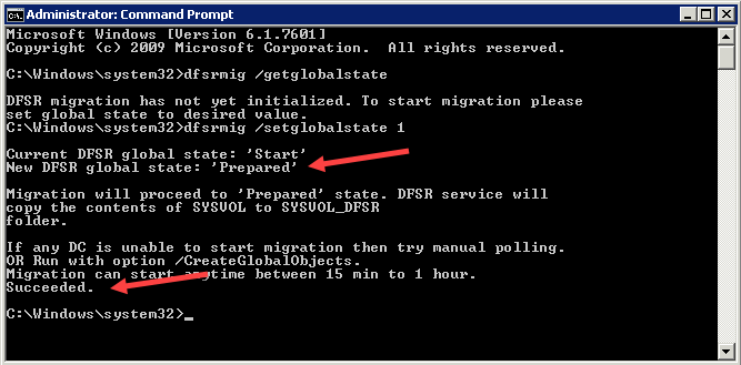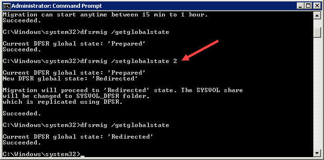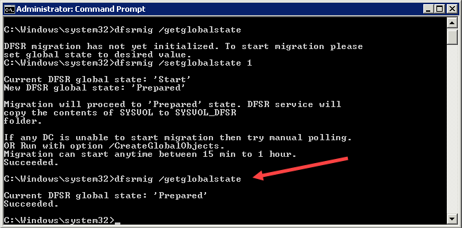 This should return that Step 1 has succeeded and the DFSR Globalstate is ‘prepared’.