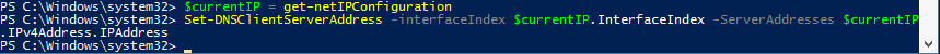 $currentIP = get-netIPConfiguration Set-DNSClientServerAddress -interfaceIndex $currentIP.InterfaceIndex -ServerAddresses $currentIP.IPv4Address.IPAddress