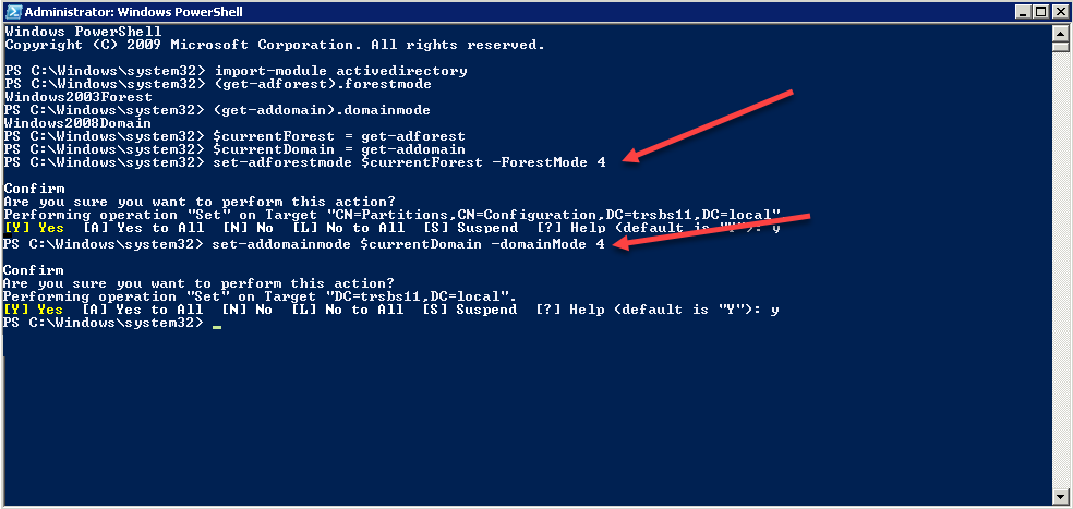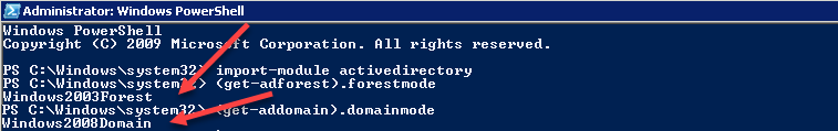 $currentForest = get-adforest $currentDomain = get-addomain set-adforestmode $currentforest -forestmode 4 set-addomainmode $currentdomain -domainmode 4