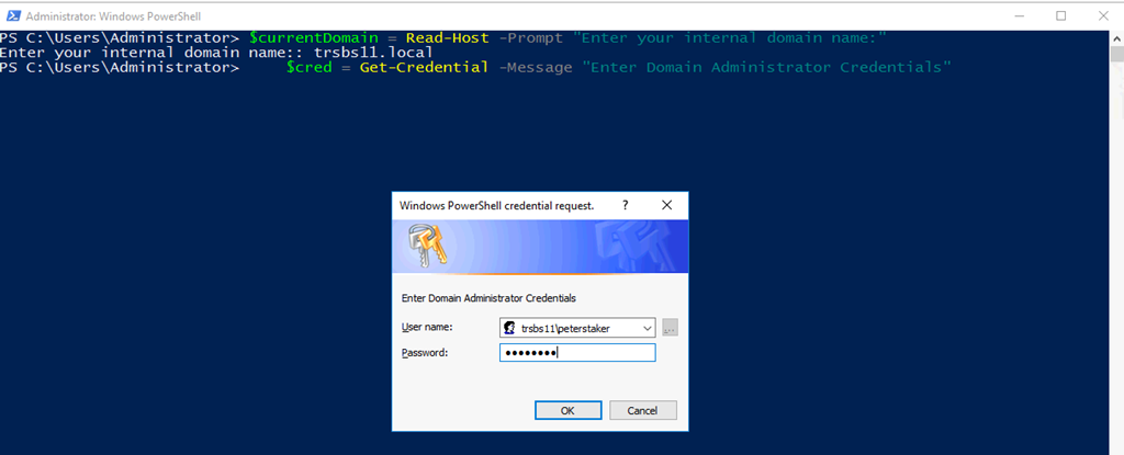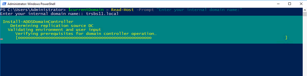 $currentDomain = Read-Host -Prompt "Enter your internal domain name:" $cred = Get-Credential -Message "Enter Domain Administrator Credentials" Install-ADDSDomainController -NoGlobalCatalog:$false -CreateDnsDelegation:$false -CriticalReplicationOnly:$false -DatabasePath "C:\Windows\NTDS" -DomainName $currentDomain -InstallDns:$true -LogPath "C:\Windows\NTDS" -NoRebootOnCompletion:$true -SysvolPath "C:\Windows\SYSVOL" -credential $cred -Force:$true -Confirm:$false -SafeModeAdministratorPassword (ConvertTo-SecureString 'ntADRSM0deP@ssword!!' -AsPlainText -Force)