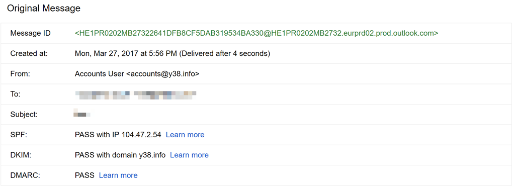 This is another good resource on DMARC and Office 365 and explains some instances where the ‘reject’ value may be modified to ‘o.reject’ or ‘oreject’ and if you have implemented the PCT feature of DMARC where the action is applied only to a percentage of your email.