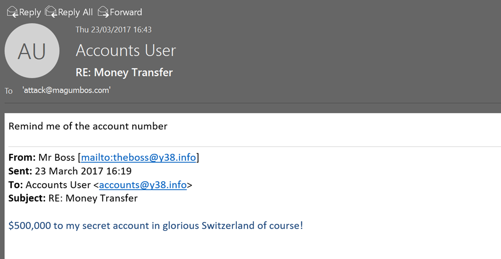 In this scenario the attacker knows The Boss’s details, and the Mrs Accounts Lady’s email address.