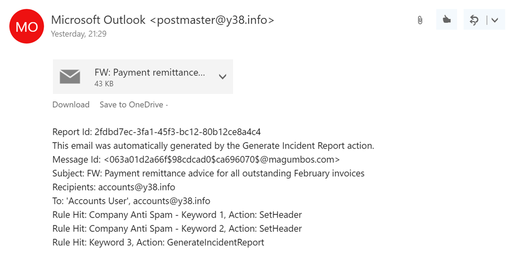 An incident report s an action that you can take when a message matches criteria you set in a rule. Office 365 then sends information about that email to a designated account.