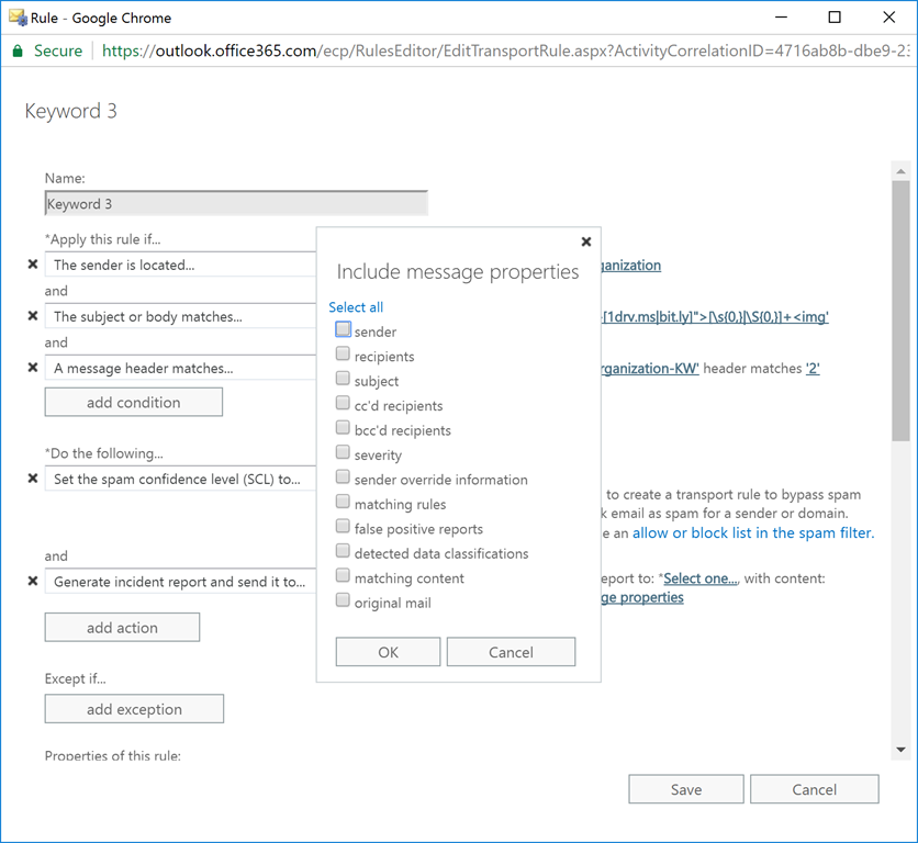 New-TransportRule "Company Anti Spam - Keyword 3" -FromScope NotInOrganization -RecipientDomainIs y38.info -RecipientAddressMatchesPatterns $regex3 -HeaderMatchesMessageHeader $header -HeaderMatchesPattern "2" -SetSCL 9