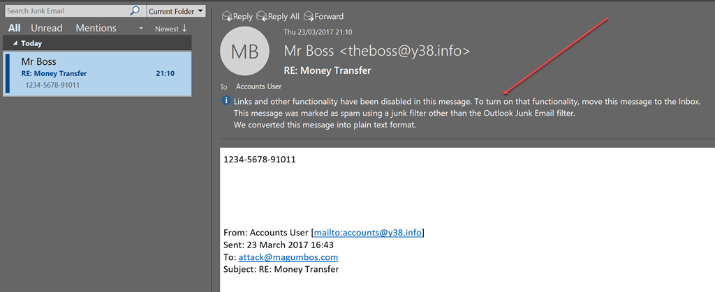 As you can see, this email has waltzed straight into our victims mailbox, and appears to come from The Boss.