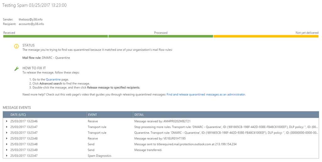 As you can see from these tests when we switch the DMARC value between Reject and Quarantine, our rules are taking the correct action to protect us.