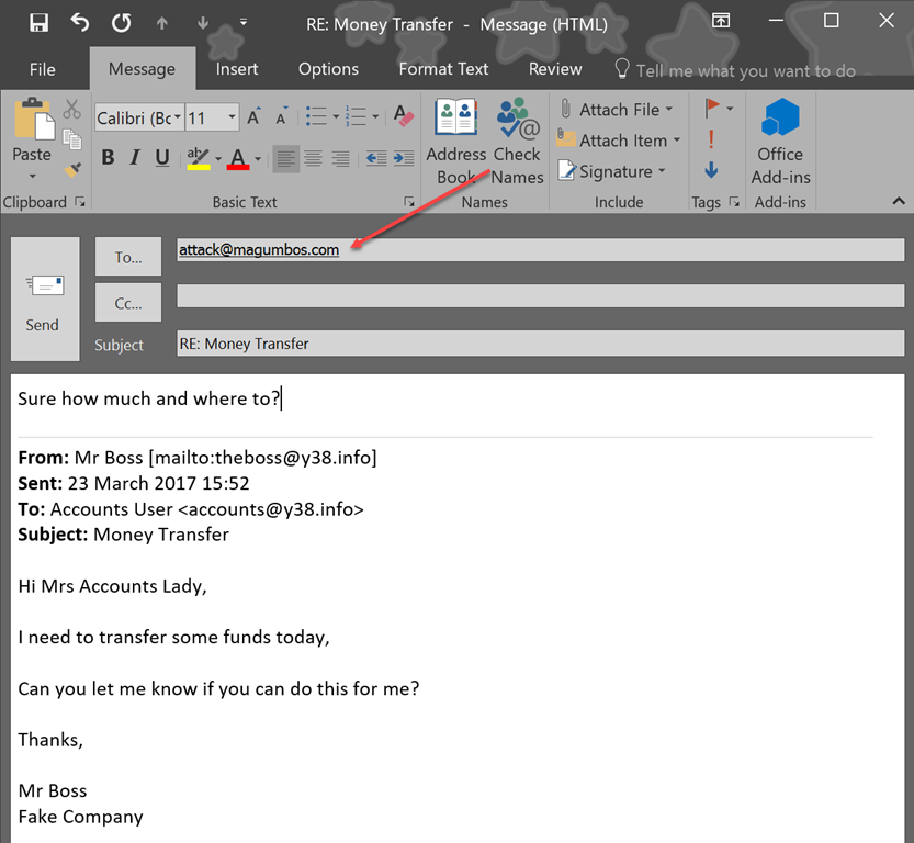 We hit reply, and don’t notice the email is going to the attacker. not The Boss.