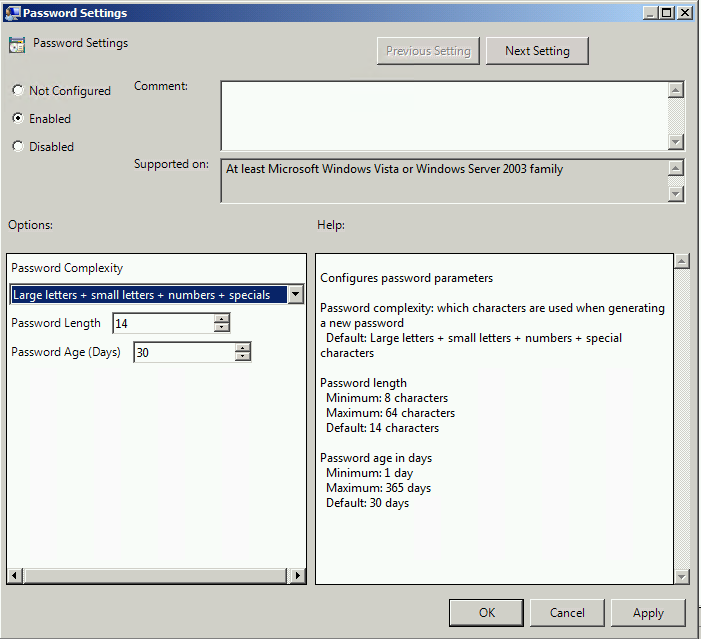 You have the option of setting different complexity requirements, I’m setting this to enabled and leaving it on the most complex option.