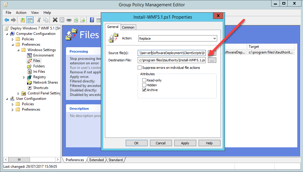 In the GPO i created two items, one a Group Policy Preference to copy the Install-WMF5.1.ps1 to the machine, and the other, a scheduled task to execute the script.