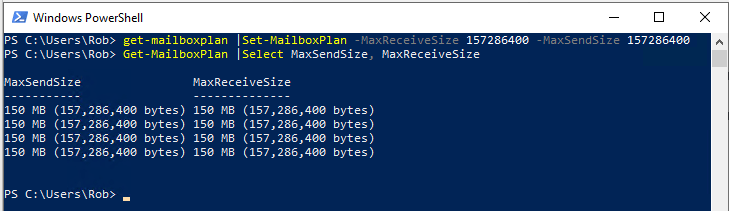 Get-MailboxPlan | Set-MailboxPlan -maxSendSize 157286400 -maxReceiveSize 157286400