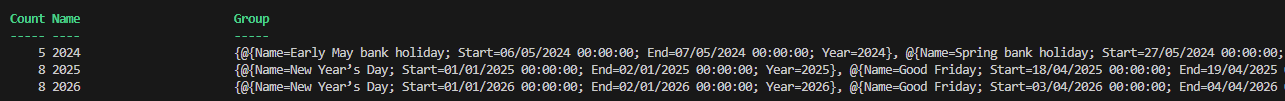 Next we have a foreach loop, which will process each date in $engWalDates and convert it to a PowerShell custom object, which includes the Bank Holiday name, the start and end date (Start Date + 1 day) and the year as a separate property.