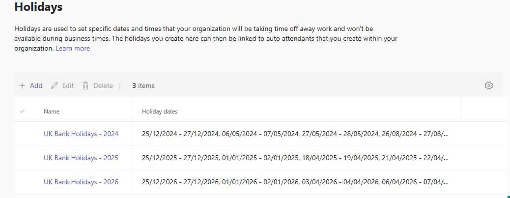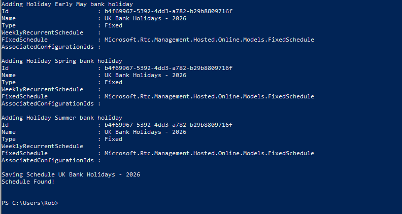 With Microsoft Teams Voice you of course benefit from a PowerShell interface to configure your system, and if we combine this with a surprisingly useful part of the gov.uk website we can can programmatically get, and input our bank holiday dates for the year ahead. In fact the current document has dates through to the end of 2026.