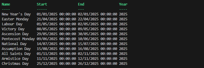 $dates = Invoke-RestMethod -uri "https://openholidaysapi.org/PublicHolidays?countryIsoCode=$countryCode&languageIsoCode=GB&validFrom=$startYear-01-01&validTo=$endYear-12-31" -ContentType "application/json"
