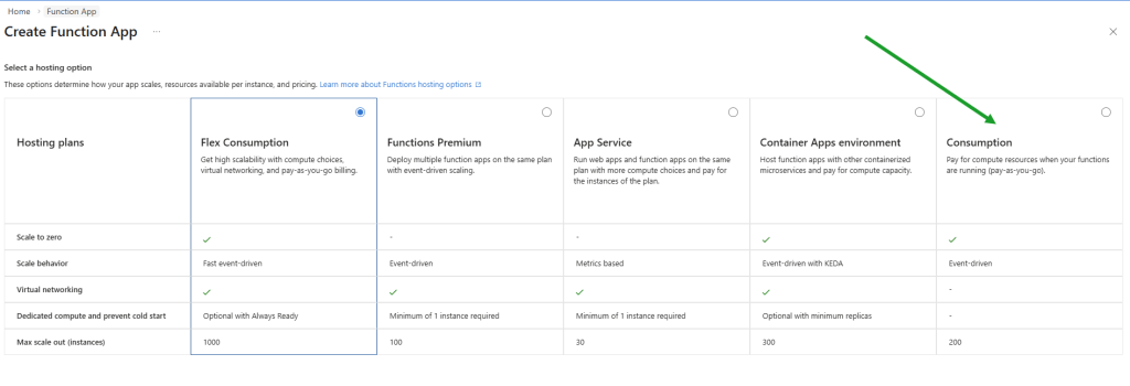 Create a new Function App, I chose the Consumption plan rather than Flex Consumption.