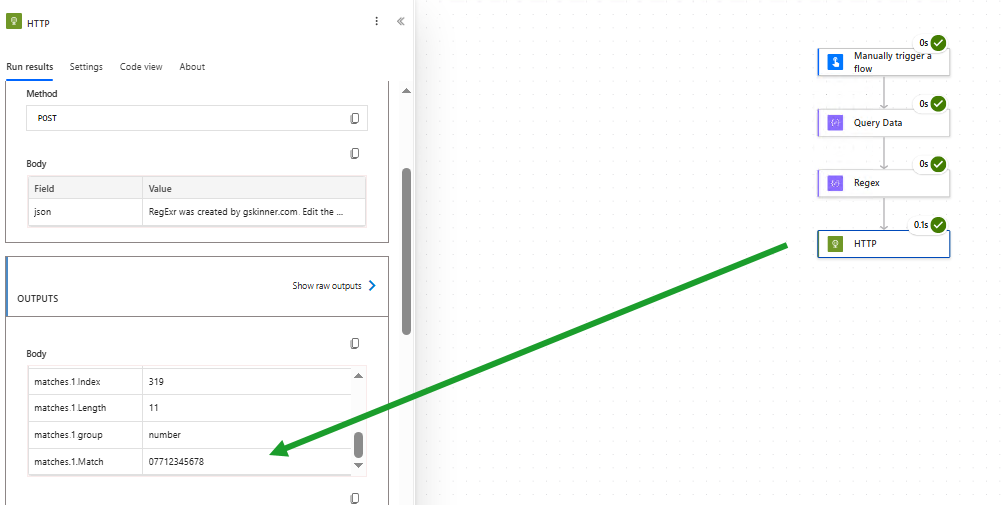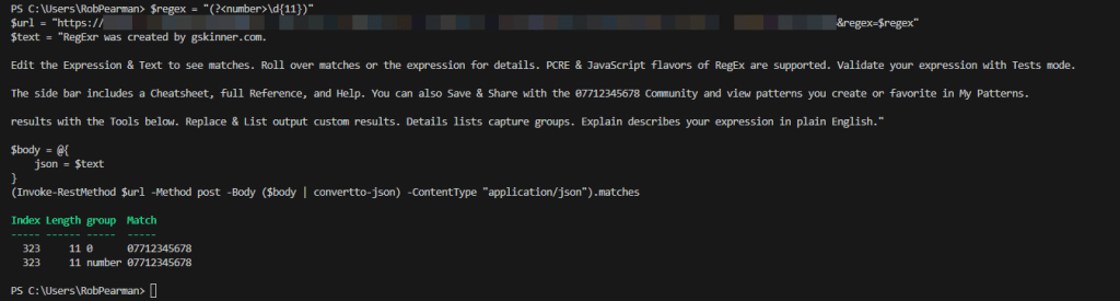$regex = "(?<number>\d{11})"$url = "https://<add your function url>®ex=$regex"$text = "RegExr was created by gskinner.com.Edit the Expression & Text to see matches. Roll over matches or the expression for details. PCRE & JavaScript flavors of RegEx are supported. Validate your expression with Tests mode.The side bar includes a Cheatsheet, full Reference, and Help. You can also Save & Share with the 07712345678 Community and view patterns you create or favorite in My Patterns. results with the Tools below. Replace & List output custom results. Details lists capture groups. Explain describes your expression in plain English."$body = @{ json = $text}(Invoke-RestMethod $url -Method post -Body ($body | convertto-json) -ContentType "application/json").matches
