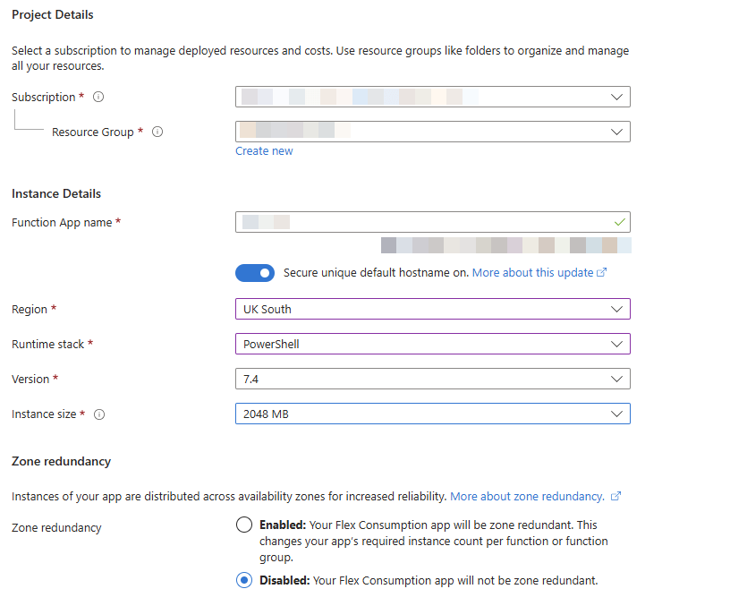 Next you are going to define your standard Azure information, Subscription, Resource Group, region etc. What you need to make sure is you choose, Windows, PowerShell, I left the instance size as 2048mb. What ill also point out at this time, is I no longer work where I first developed this, and I’m only writing it up as someone on Reddit asked about it, so I’m doing this from scratch and the interface/options in Azure are different from when I first did it.