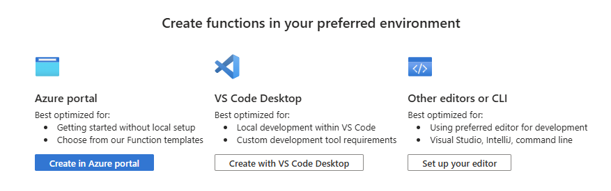 For ease of use, I’m going to create in the Portal, but integrating with VS Code is actually very cool, and you can spin up the HTTP Trigger function on your own device and test it locally before pushing it up to Azure. Note, if you do decide to deploy from VS Code, the function becomes read only in the portal.