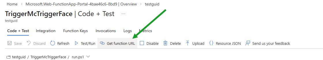 Clicking on create will take you to the code editor of run.ps1. run.ps1 is the file that surprisingly enough is run when the function triggers.