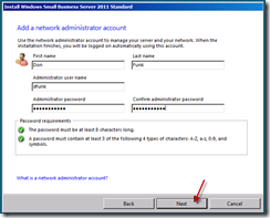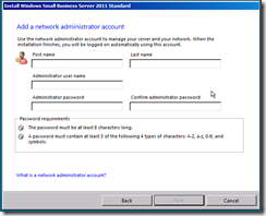 As was the case with SBS 2008, the Administrator account is unavailable for use here, so you must choose a new name and password.