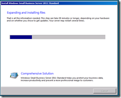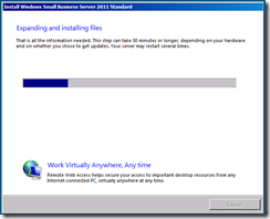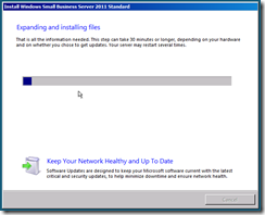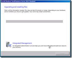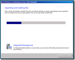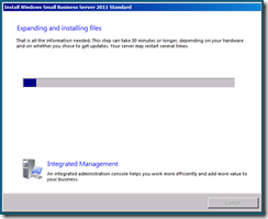 The server will now shutdown and restart, when it boots back up you will have a period of time to wait whilst the server expands and installs the SBS installation. You can choose to sit and wait and read the inspirational messages about how much more efficient your company will be once the install has finished and how the integrated management console will add value to your business, or you can take a break for about 30 minutes and finish that coffee.