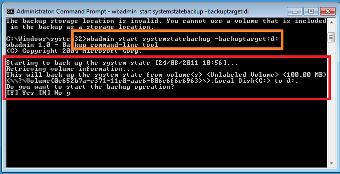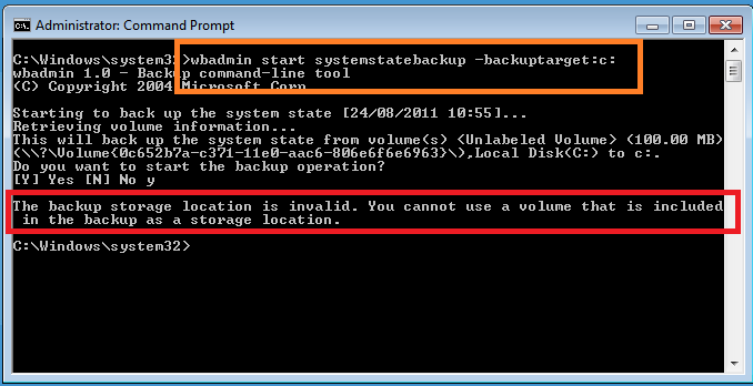 To run a system state backup we can use the wbadmin command tool. You choose to run your system state backup to a volume, not a folder, however you cannot use a location that is included in the backup as the destination, so for example the below command will fail.