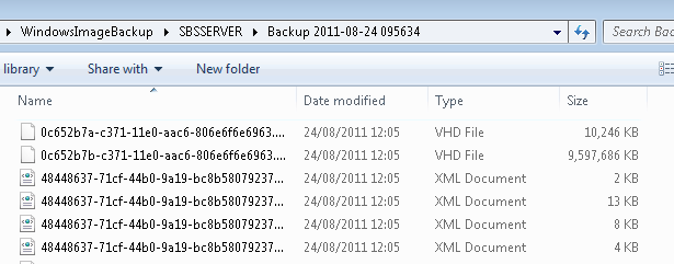 Now inside here we have several folders, the backup itself is contained within the Backup folder, and it is named with a date and time that the backup was launched. Inside this folder will be some XML files and a VHD per volume backed up.