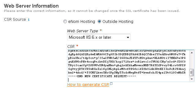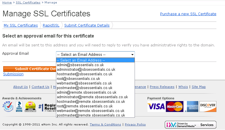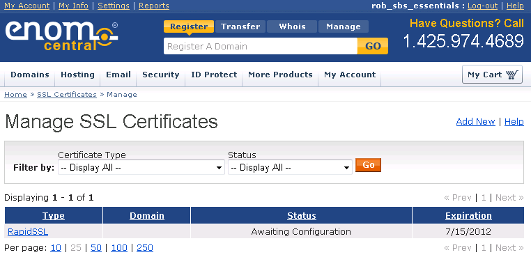 So i copy this info to my clipboard and go to the eNom site, login and head for SSL Certificates..