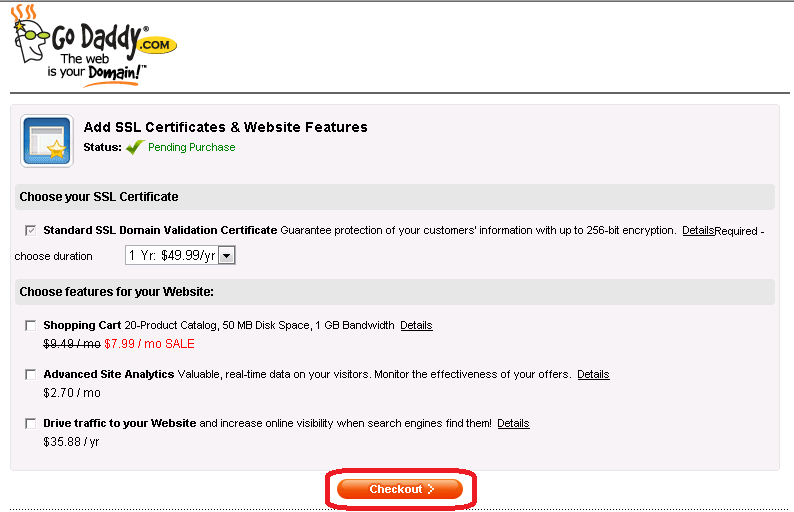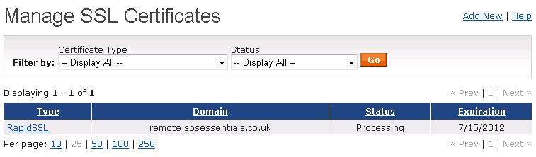 You are then returned to your Manage SSL home page, and the status is now Processing.