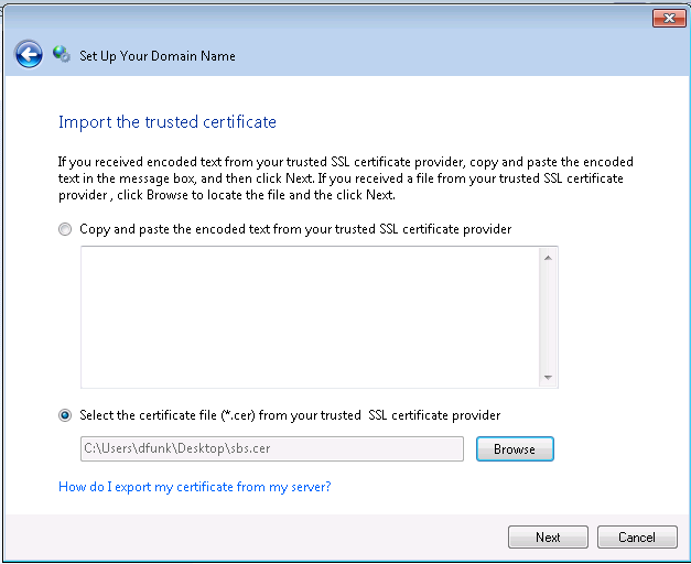 As i saved my certificate to a file, i can now browse to it, alternatively you can just paste that info into this box..