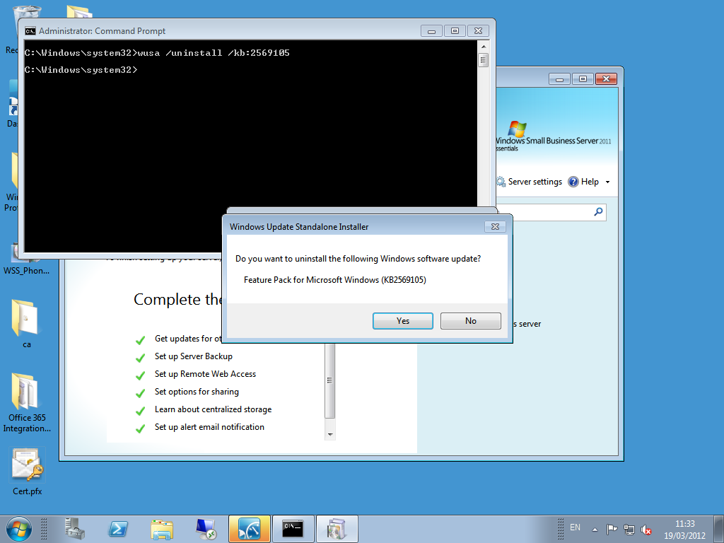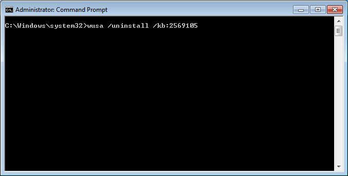 Next, move to an elevated command prompt, and enter the following. WUSA /UNINSTALL /KB:2569105