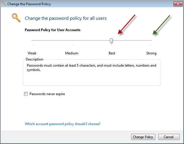 After a reboot you can then open the Dashboard, go to the Users tab, and click Set the Password Policy, and you should find your slide bar is now working.