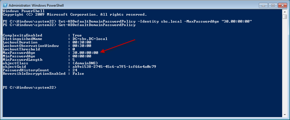 Set-ADDefaultDomainPasswordPolicy –identity sbs.local –MaxPasswordAge “30.00:00:00”