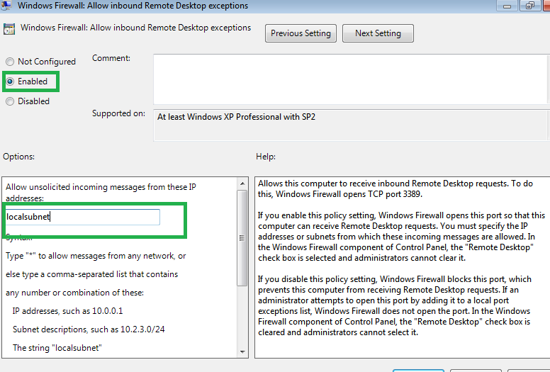 We will now move to, Allow Inbound file and printer sharing exception’ Set this to enabled, then under options enter ‘localsubnet’