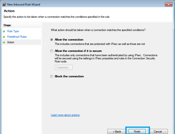 You will be asked what action to take when a connection matches this rule. We want to allow. Click finish.