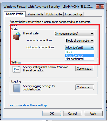 On the domain tab, set the Firewall state to On. Set Inbound Connections Block (Default) this will block anything that is not defined in our exceptions, we will set those in a moment. Set outbound connections to Allow (Default)